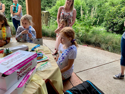 It was relatively easy getting ready on the day of their birthday party. Brooke went and got the girls donuts (they decided on donuts over cupcakes) and found some cute decorations at the Dollar Store. I got the site early to hold it (since it was first come first serve) and then Sean held it for us. The party was from 1:00-3:30 PM so we had the donuts, some light packaged snacks, juice boxes, and then Kona Ice of course so we didn't have to set up a lot of food. We also wanted to cut down on any food handling exposure. We got lucky with the weather and it was a warm 75 degree day with sunshine (it was supposed to rain the next day). The girls were very excited for their birthday and it was fun that they got to celebrate together. We got the site all set up and hung the 2 pinatas and then got some cute birthday pictures of the girls before the guests came.